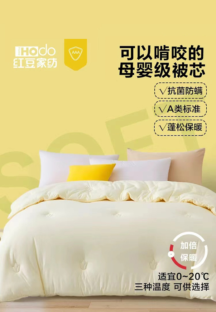 紅豆家紡有限公司是紅豆集團(tuán)子公司之一,自1998年成立以來,紅豆家紡不斷推進(jìn)品牌建設(shè),實(shí)現(xiàn)轉(zhuǎn)型升級(jí),逐漸形成了HOdo紅豆家紡連鎖專賣、電子商務(wù)、家紡生產(chǎn)、小商品四大產(chǎn)業(yè)布局。多年來,紅豆家紡榮獲了“十大環(huán)保家紡品牌”、“中國最具流行魅力家用紡織品品牌”、“新銳時(shí)尚品牌”和“全國紡織實(shí)施卓越績(jī)效模式先進(jìn)企業(yè)”等榮譽(yù)。紅豆家紡始終堅(jiān)持“品質(zhì)至上”,集設(shè)計(jì)、生產(chǎn)、銷售于一體,以“親情、愛情、友情”為品牌的核心理念,積極打造“溫馨、經(jīng)典、時(shí)尚”的家紡產(chǎn)品。產(chǎn)品涵蓋家居產(chǎn)品全系列,被芯系列、套件系列、枕芯系列、婚慶系列、絨毯系列、床墊系列、夏涼系列等上千種產(chǎn)品,以滿足家居紡織品一站式的消費(fèi)方式。