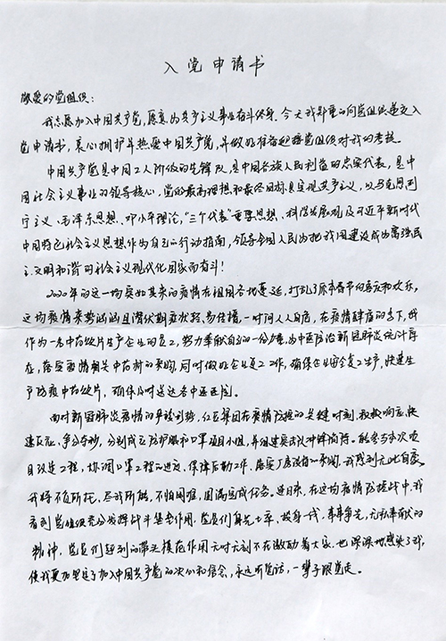 紅豆集團(tuán)國際公司的員工梁艷的再次向黨組織遞交入黨申請(qǐng)書的原因很簡單,“為了支持一線疫情防控,集團(tuán)緊急組建黨員突擊隊(duì)支援防護(hù)服、口罩生產(chǎn)線,負(fù)責(zé)最緊急、最艱苦的工作。我也報(bào)名了,因我還不是黨員,所以沒有把最重的任務(wù)安排給我?!笔艿缴磉咟h員的激勵(lì),讓梁艷鼓起勇氣,擬出了這份“疫情火線入黨申請(qǐng)書”。
